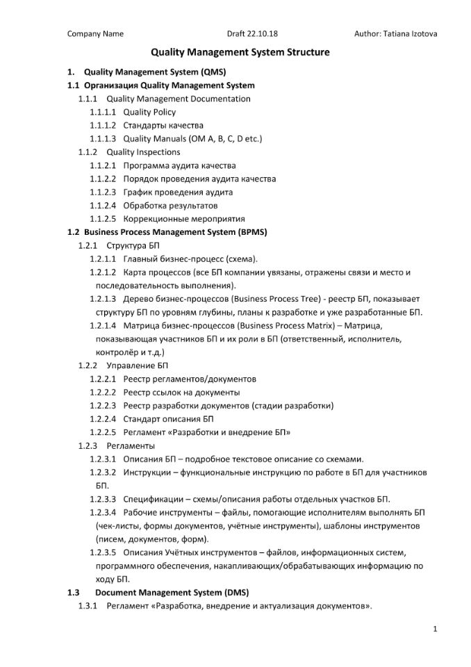 Разработана подробная структура документа "Система менеджмента качества".