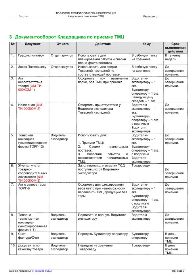 Задача: разработать технологическую инструкцию кладовщика по приёмке, размещению и отгрузки ТМЦ